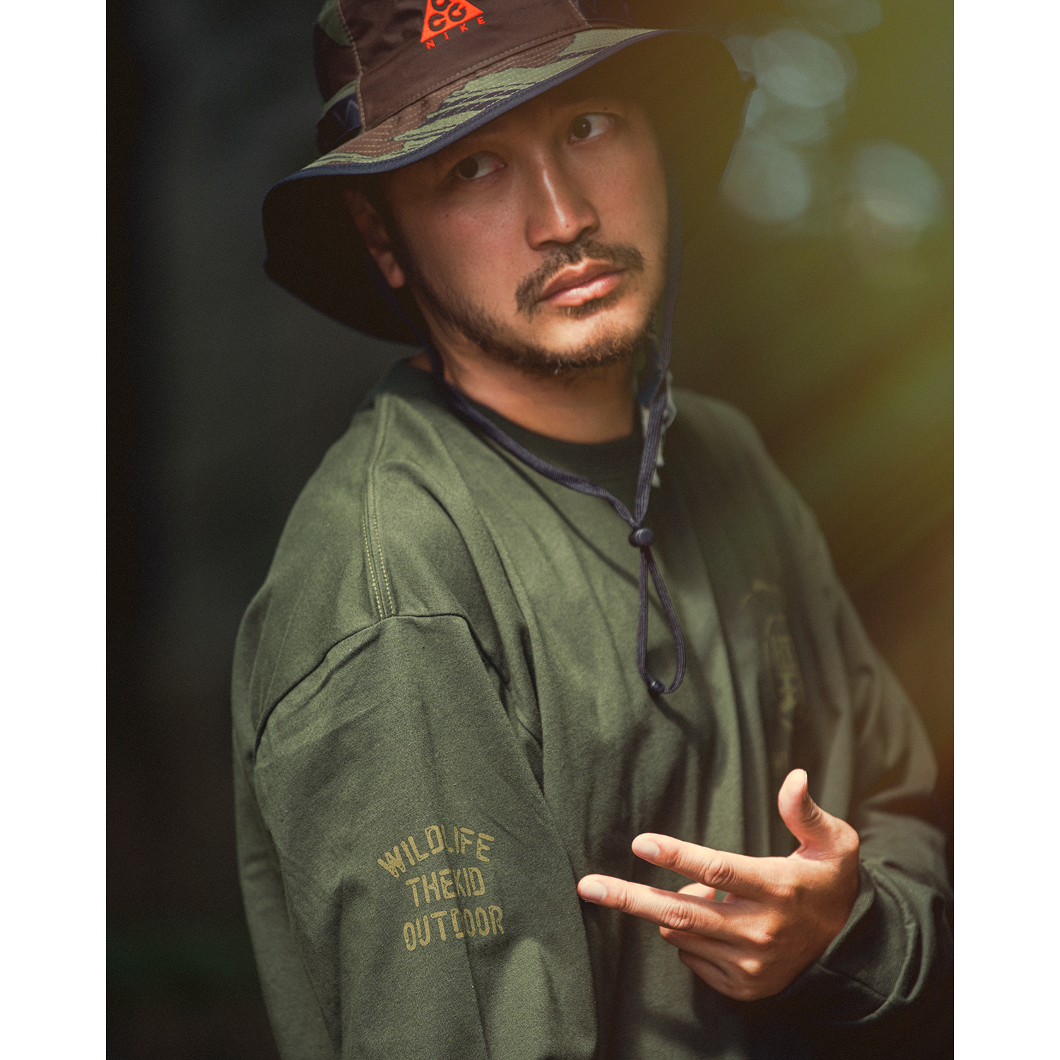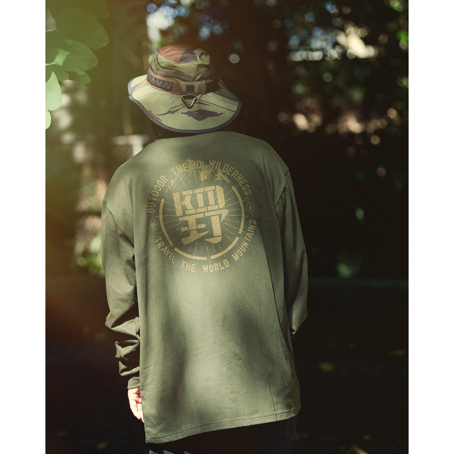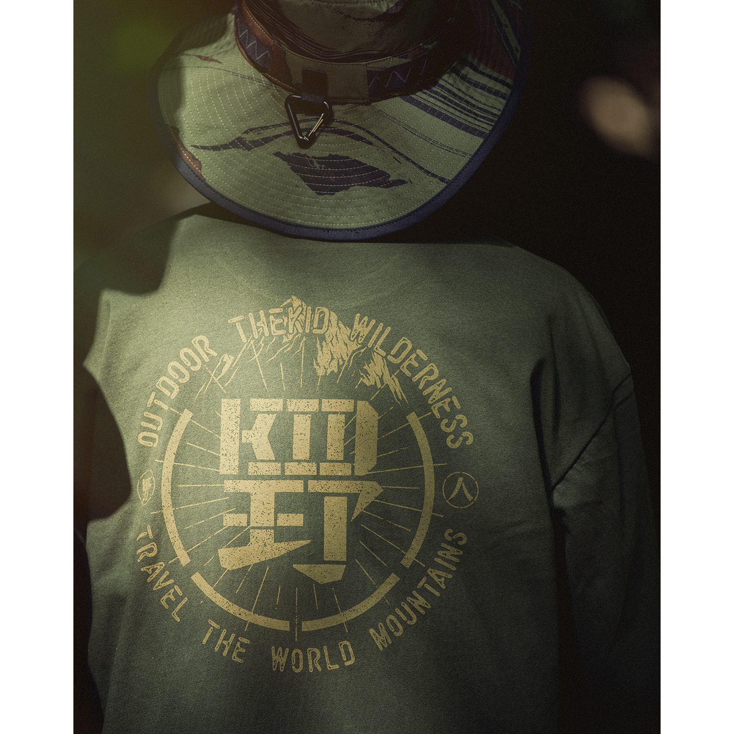 Kid與兩個野人logo結合並重新設計,呈現於胸口與背面,背後上繪製山脈與標語,營造山系野人氛圍。