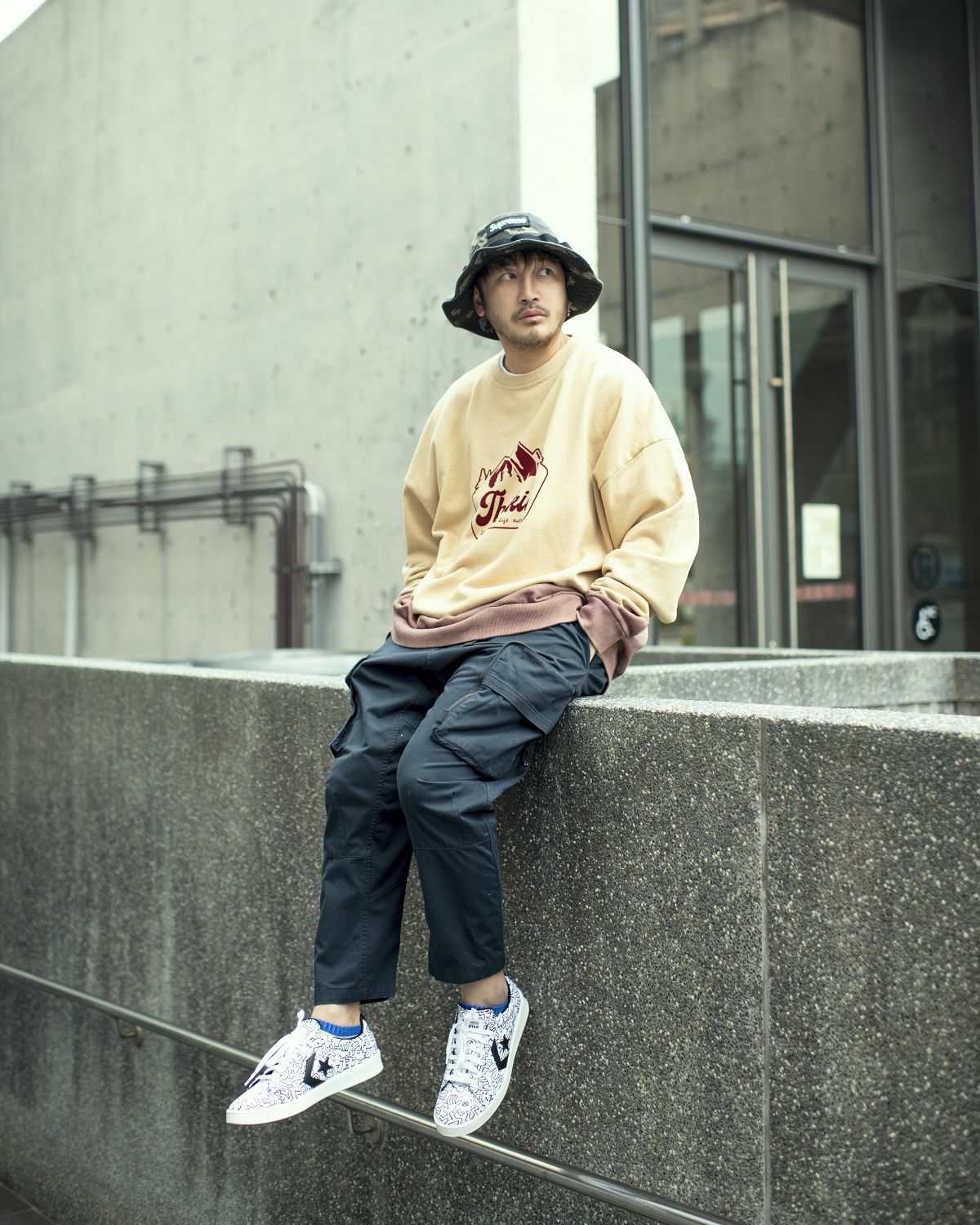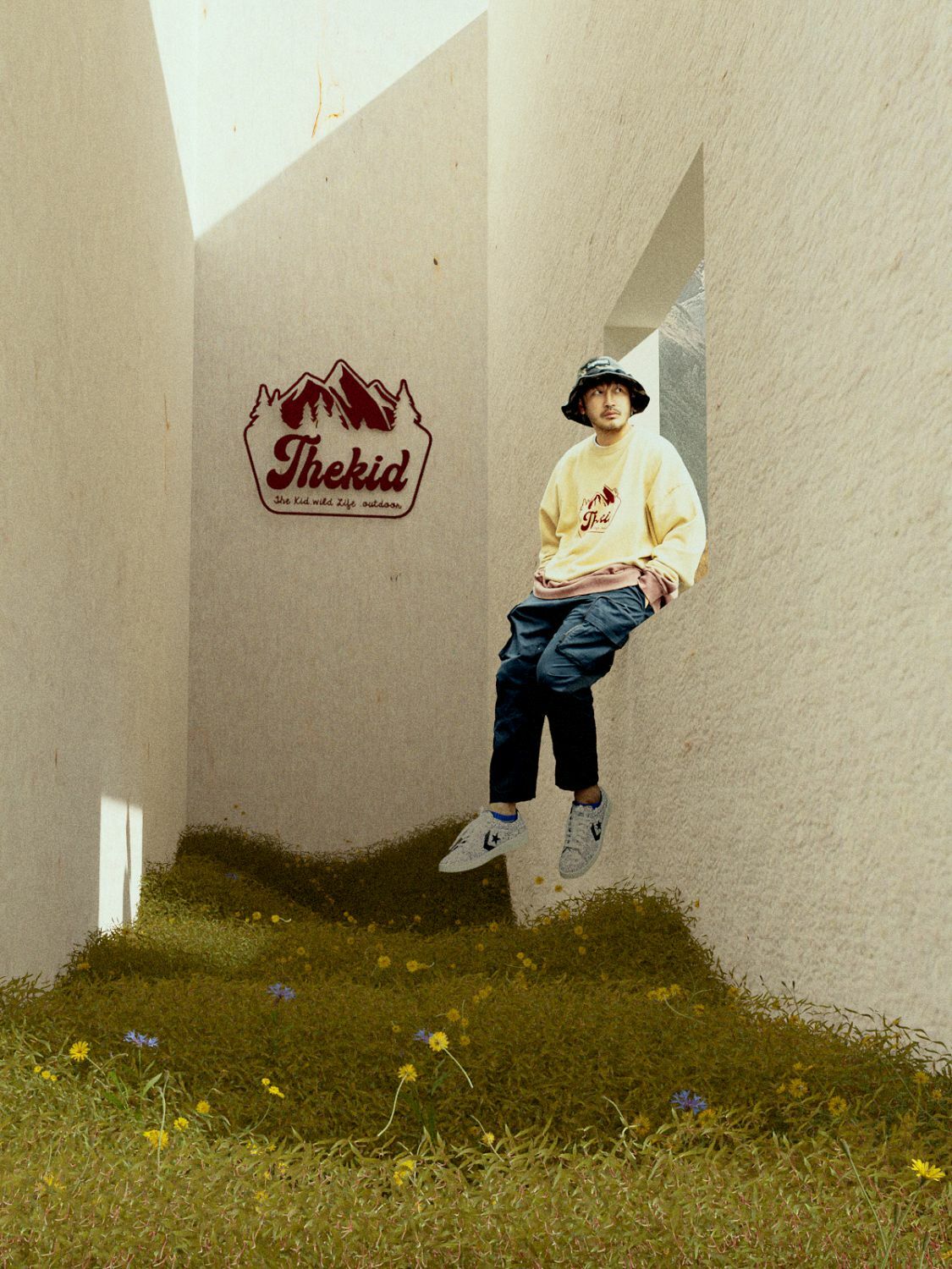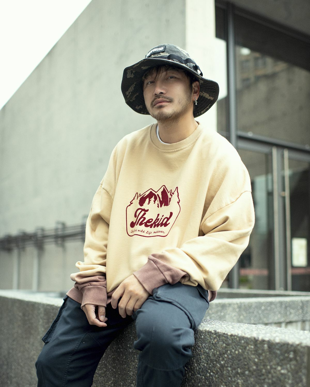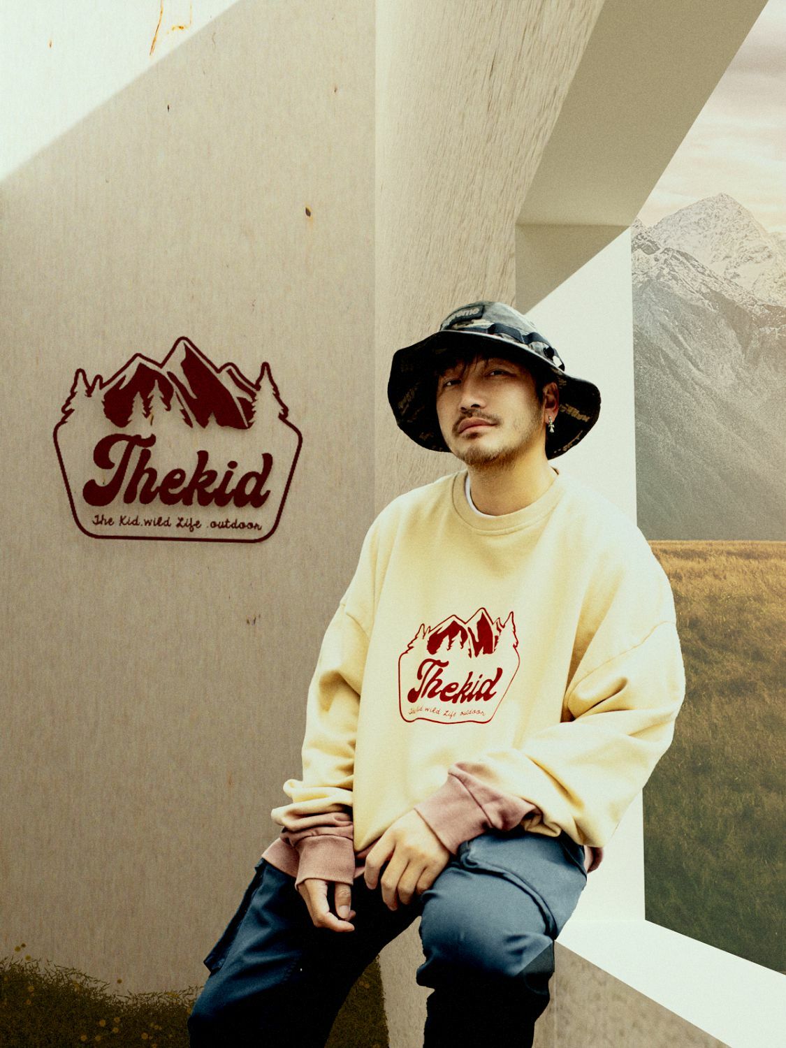 落肩寬鬆舒適的大學T版型,THEKID手寫字與山峰圖騰搭配懸吊式手染效果,在秋冬中呈現獨特的野人風格。