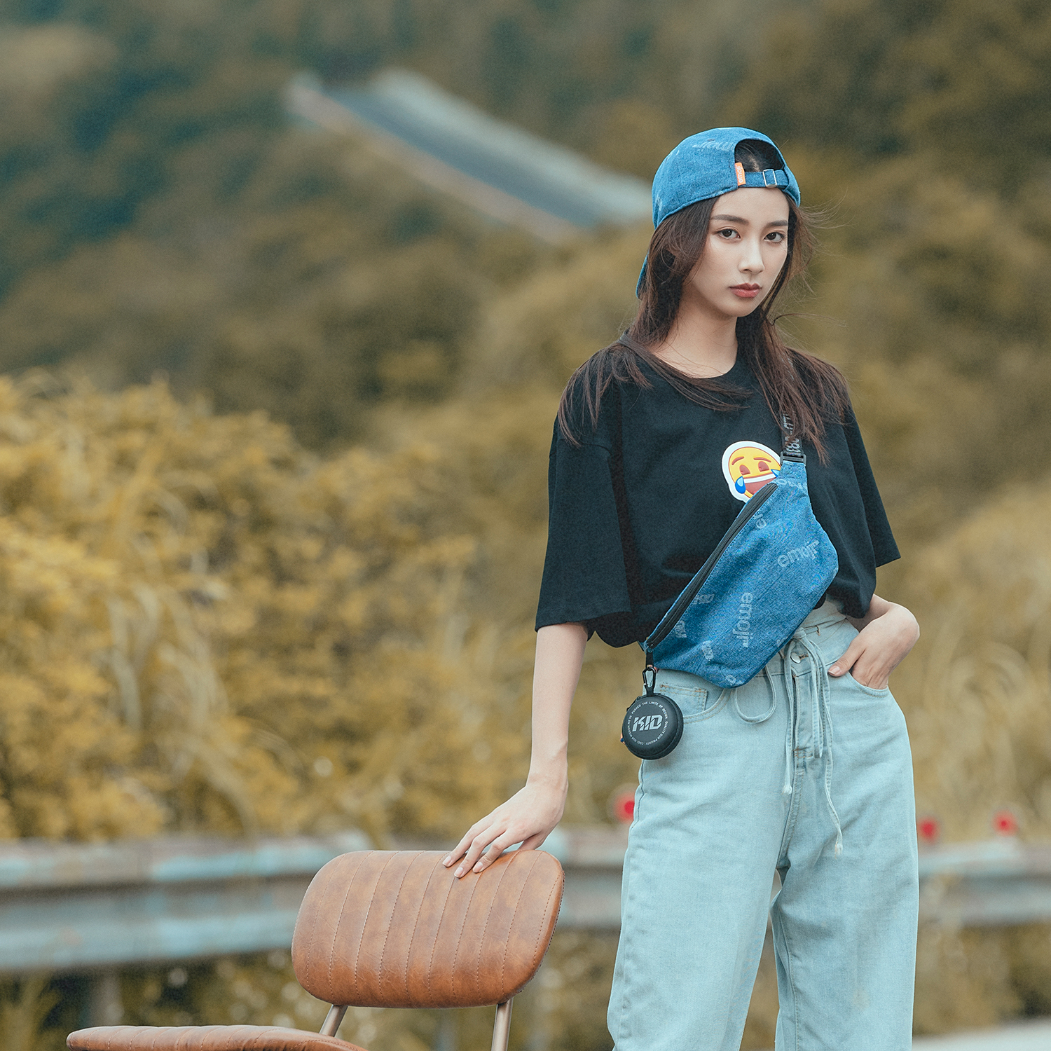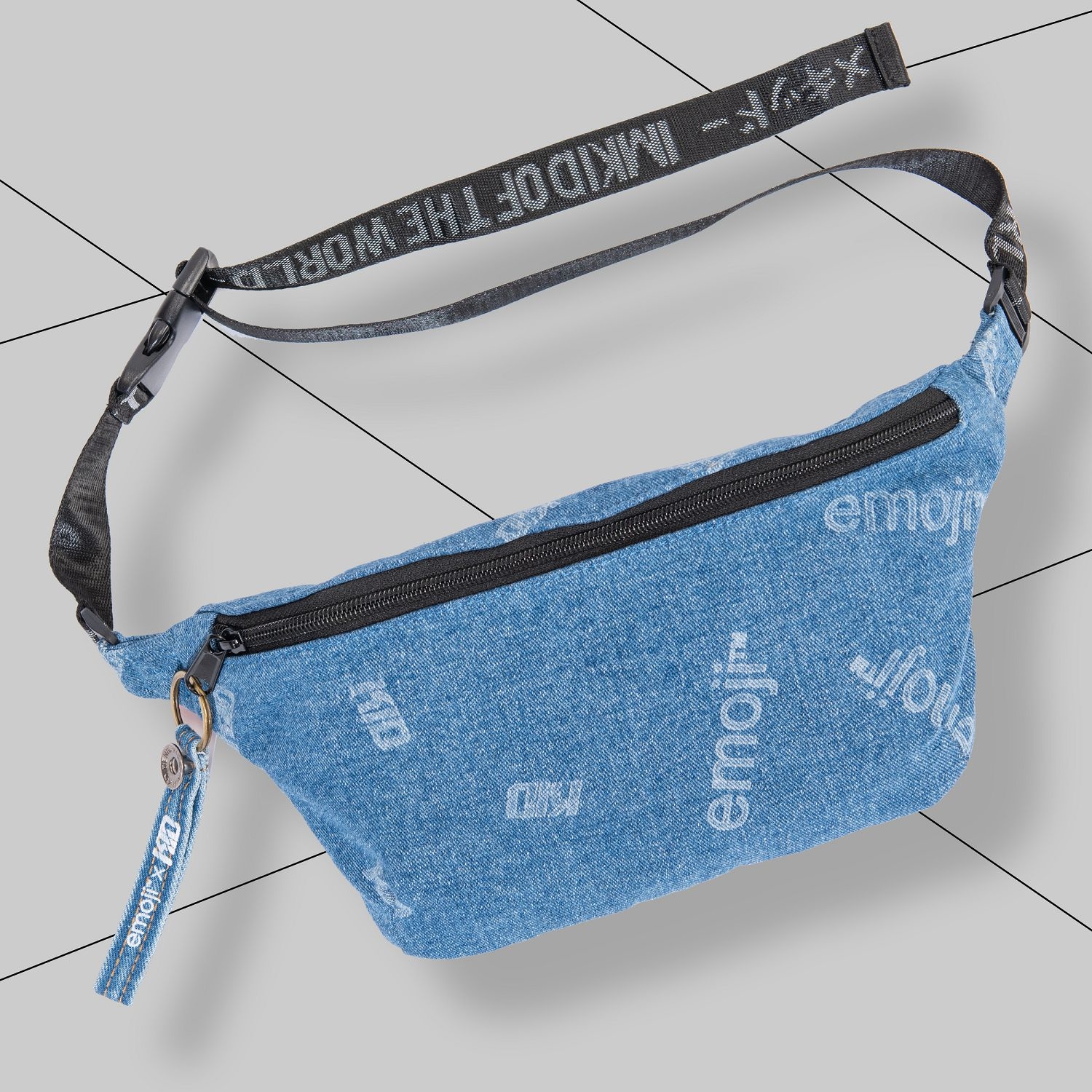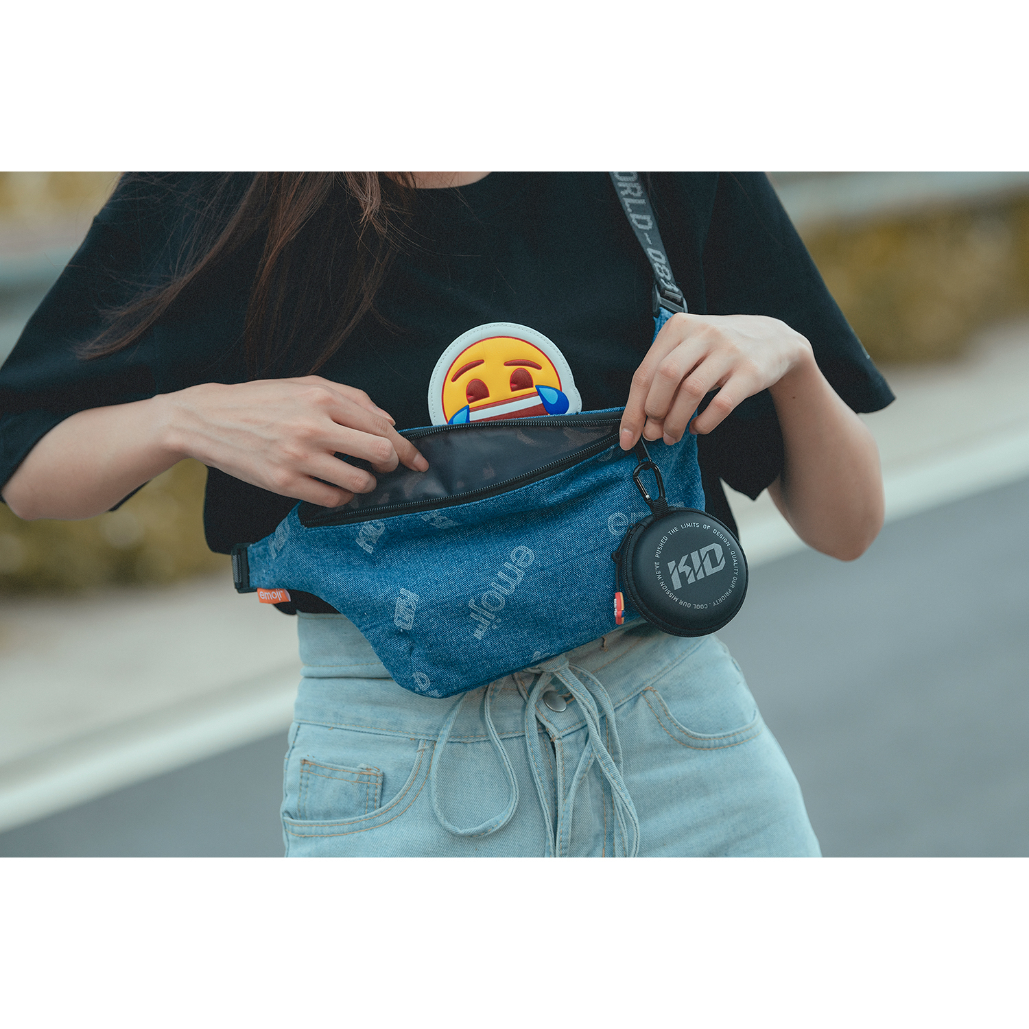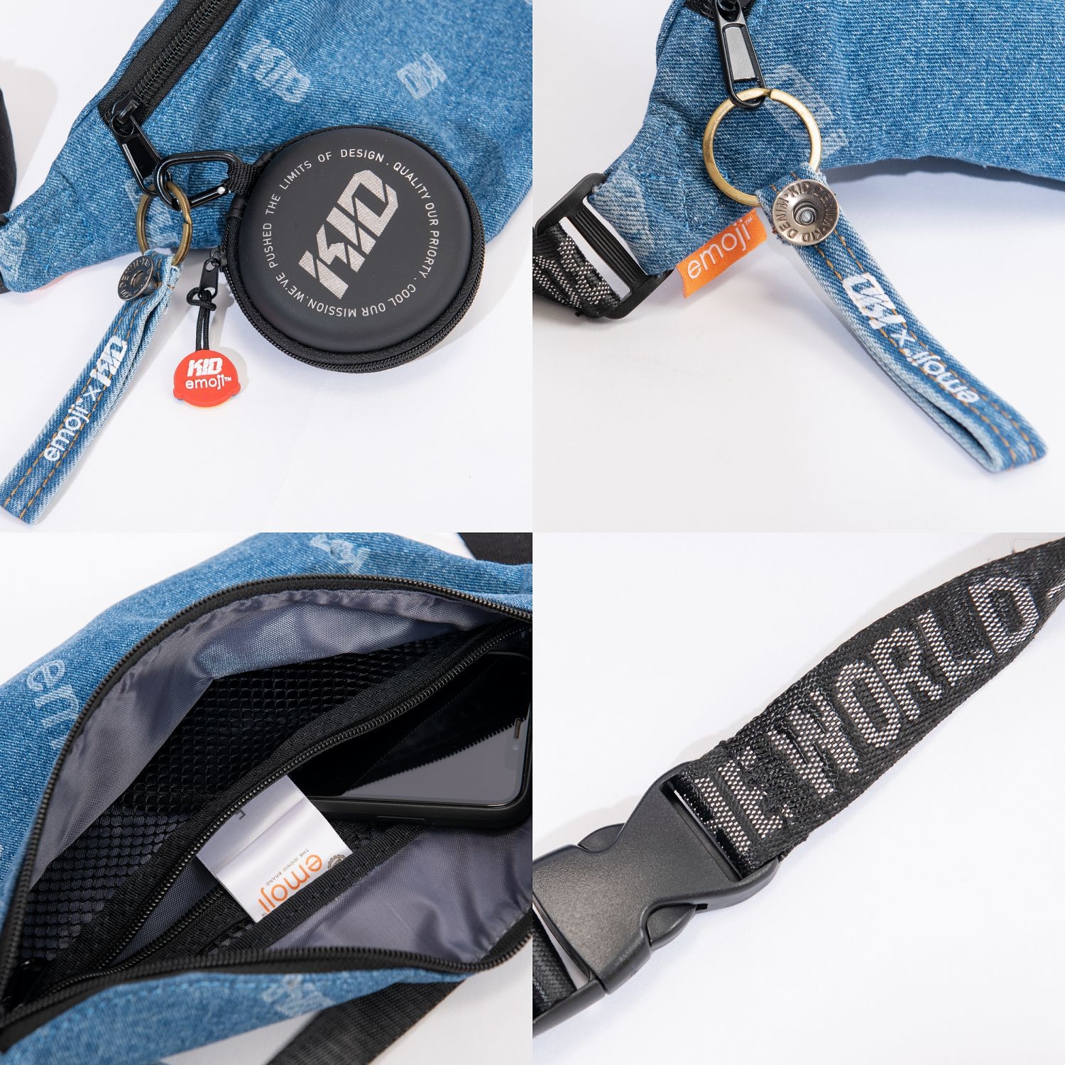 採用厚磅丹寧布料製作,以emoji與KID LOGO為設計主題,圖案採雷射高溫燒繪技術製作
